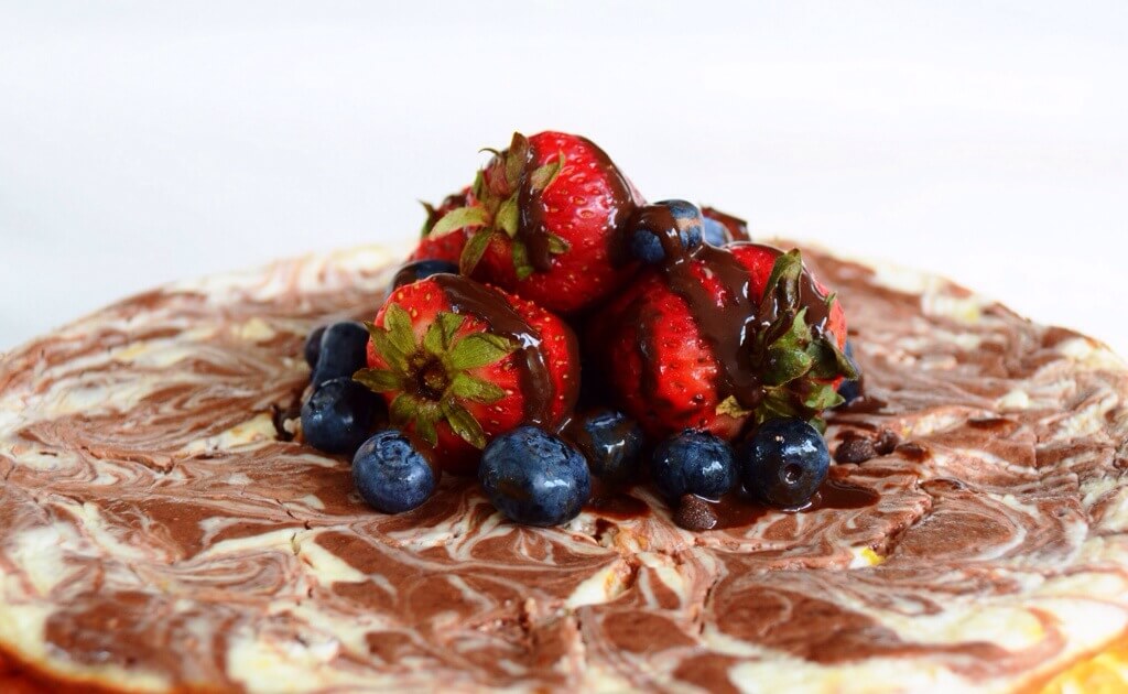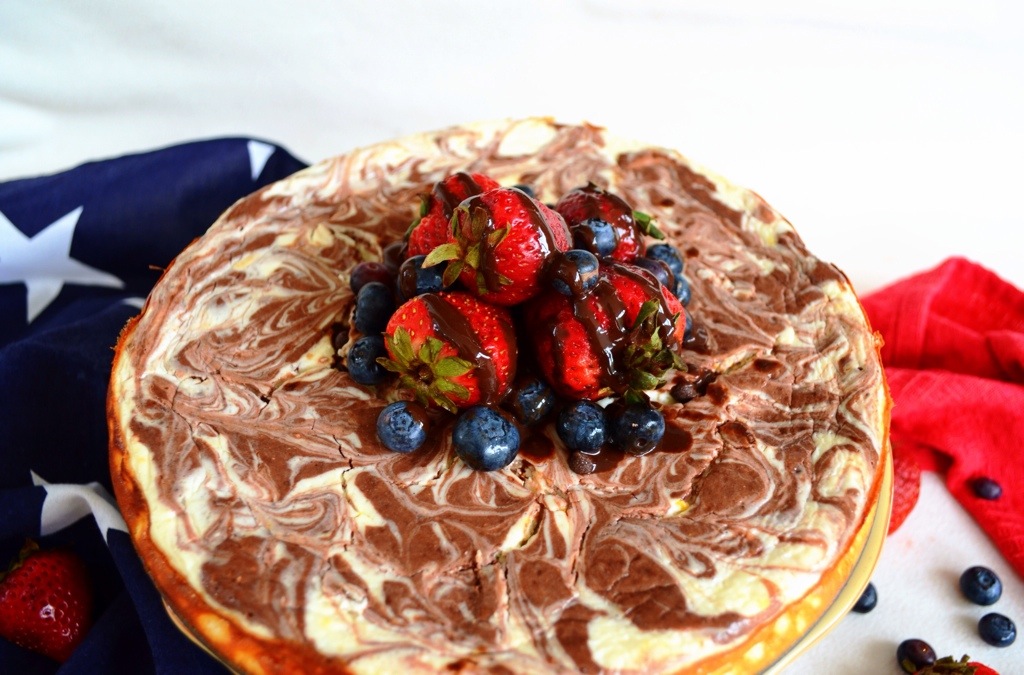 TIP: To create the marble effect, I melted a 1/4 cup of dark chocolate and poured it over the batter before I stuck the cheesecake into the oven. Once I poured the chocolate, I mixed it around into swirls with a toothpick. Then, I stuck it in the oven to bake. This isn’t important for the taste, just the appearance.