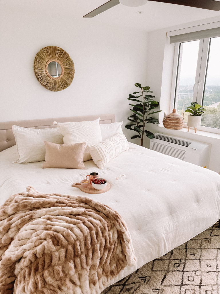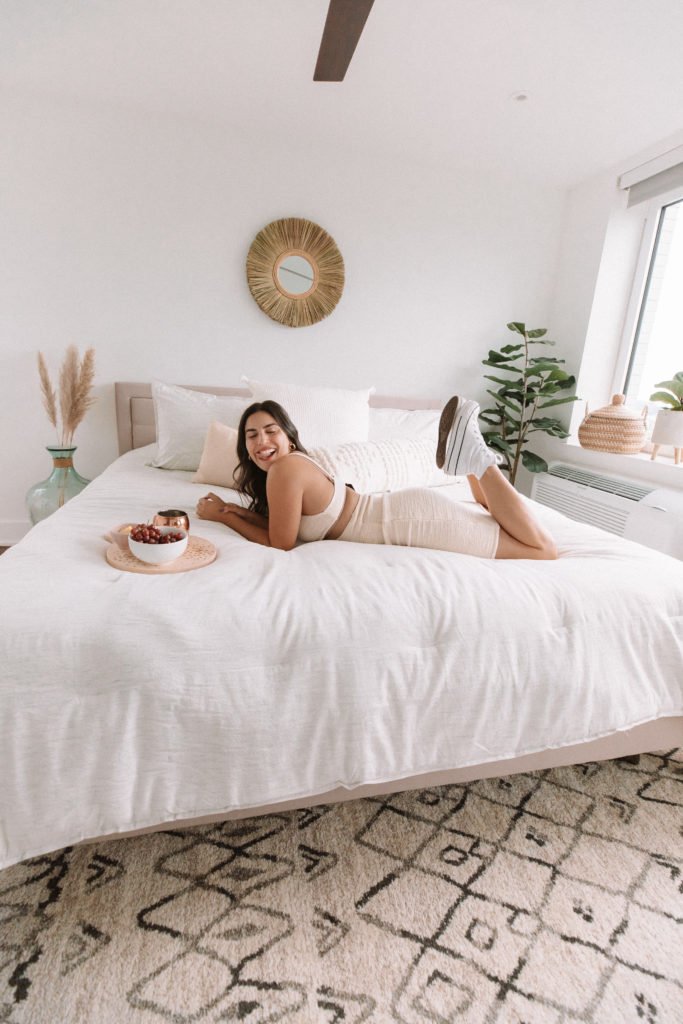 Ever want to refresh your space when a new season rolls around? Me and you both! New seasons call for new needs, vibes, etc, and there is no better way to make yourself feel inspired then by loving the space you’re in. This month, I decided to do a little Bedroom Refresh. Our bedrooms often tend to be one of those rooms that get a little neglected since we think of them mainly for sleeping, not for hanging out. Everyone needs a little retreat of their own though, so I encourage you to spend a little time updating your bedroom for summer! A little decluttering and a few seasonal touches can totally transform it into your own summer paradise and be a total mood booster every single day.