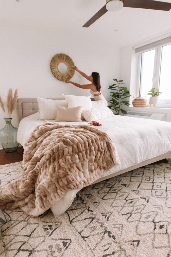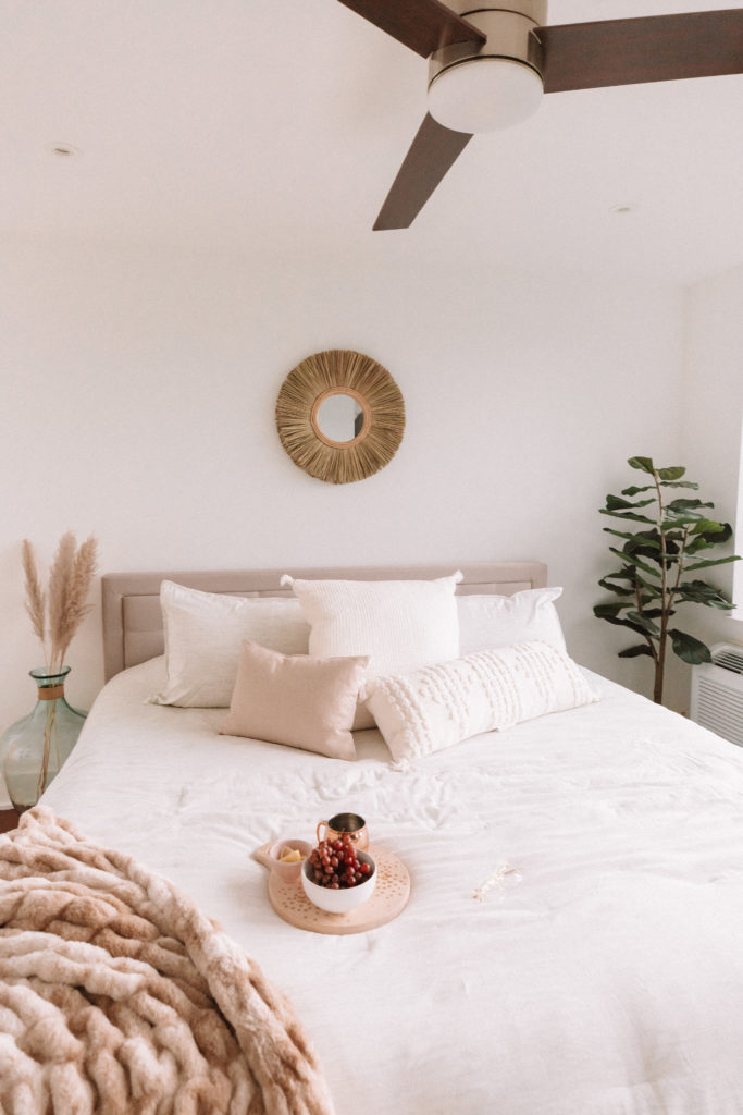 Similar to wall decor, light fixtures help to dictate a theme for your room. While they are a bit more involved then a comforter, or wall decor update, it is SO worth it the extra bit of effort to hang them! I found this really fun Seagrass Pendant Light (around $100 which is a STEAL) and love it! It gives me major Bali Resort vibes which i’m all above. You can do one above each side of your bed, or one in the center!