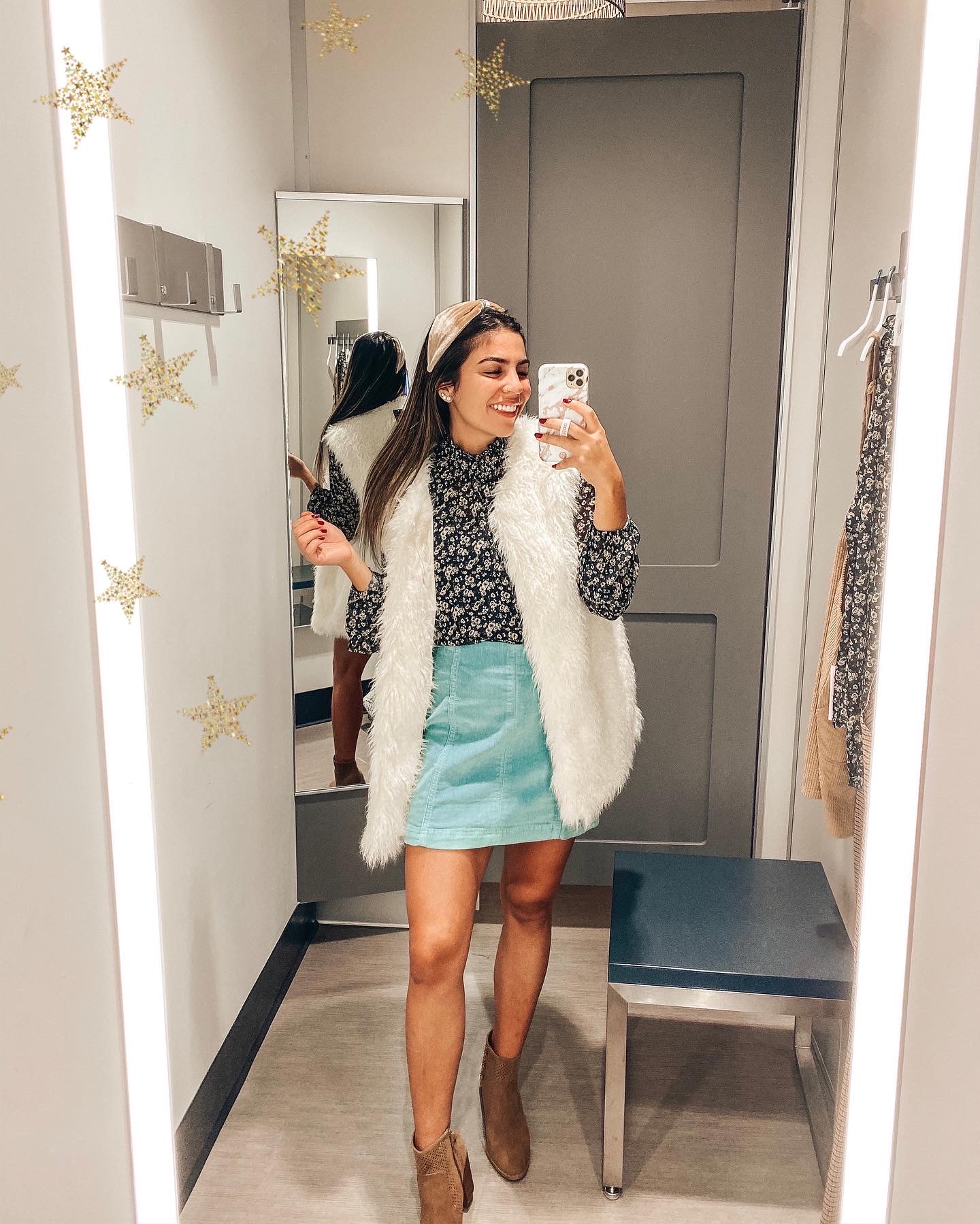 Three simple pieces added together can become magic! I love dressing up a simple skirt and blouse look with a fur vest and a headband. Small accessories like really add an extra dimension to the look.