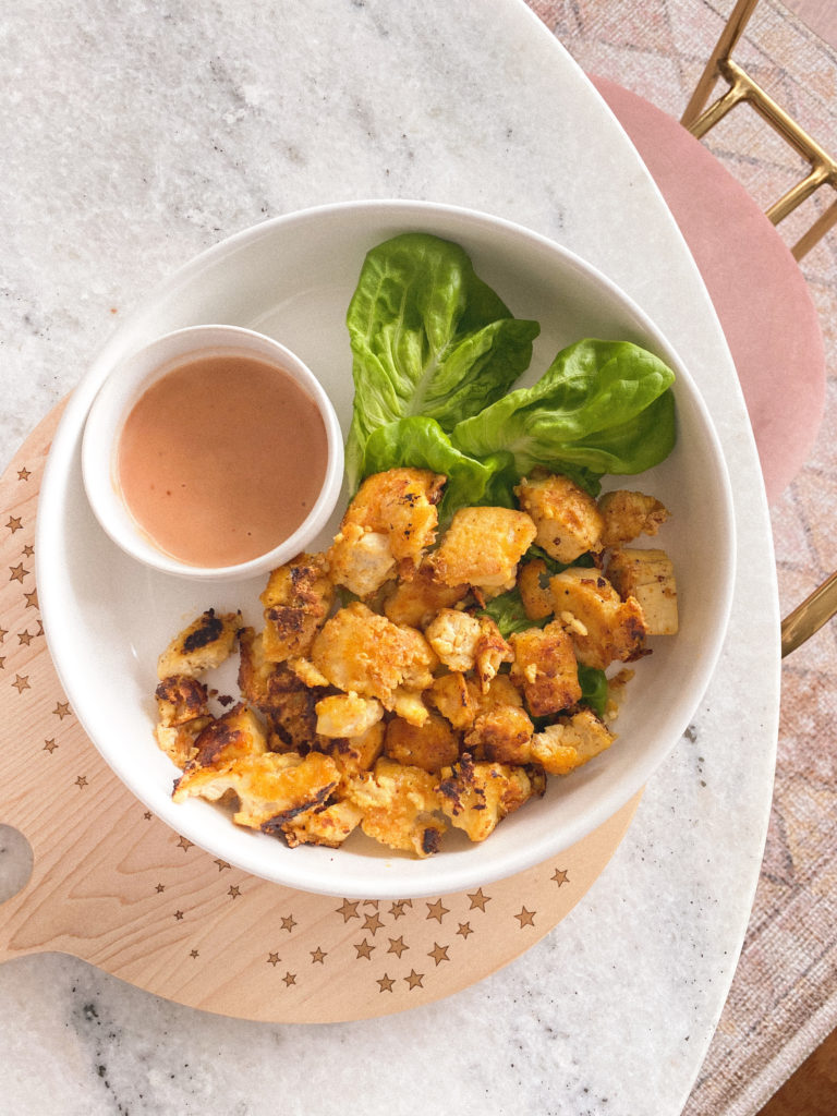 I love adding tofu to salads, bowls, or eating alone with some rice and a green! It’s also perfect as a high protein snack or appetizer since it’s small and delicious. Here, I paired it to with a my favorite dip (buffalo sauce + vegan mayo).