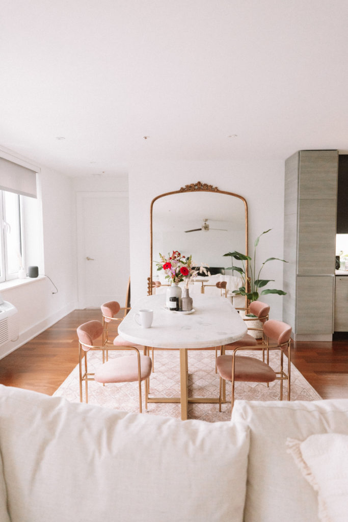 For the dining area, I knew I wanted pops of blush and gold, like these incredible dining chairs, while still keeping the space really relaxed. I fell in love with the oval shape of this table the minute I saw it, it feels really unique and special. To tone down the *glam* elements of the blush and gold and make them a bit more bohemian, I decided to add a Moroccan rug, and a big bird of paradise plant to keep the natural vibes. Then, to tie it all together, I added a big floor mirror (my favorite piece in my home!) to make the space nice and open. If you’re working with smaller space, a floor mirror really helps to make it *look bigger*. It creates soo much depth!