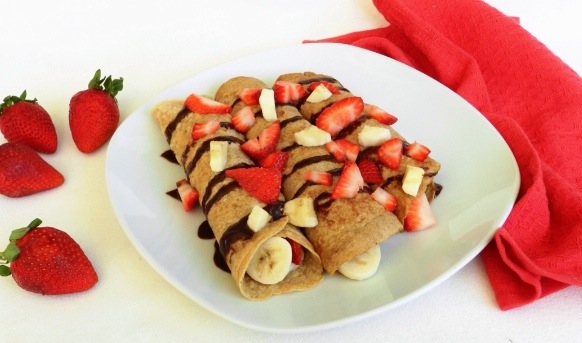 That’s it! Combine the ingredients above in a blender and blend until smooth. Pour 1/3 of the batter into a heated, sprayed pan, and then proceed to cook the crepes one at a time. Cook on medium for about 2-3 minutes on each side, or until you think they look as done as you like them. Once you have 3 crepes, roll them up with a filling of your choice. I used strawberries and bananas that I tossed in honey.